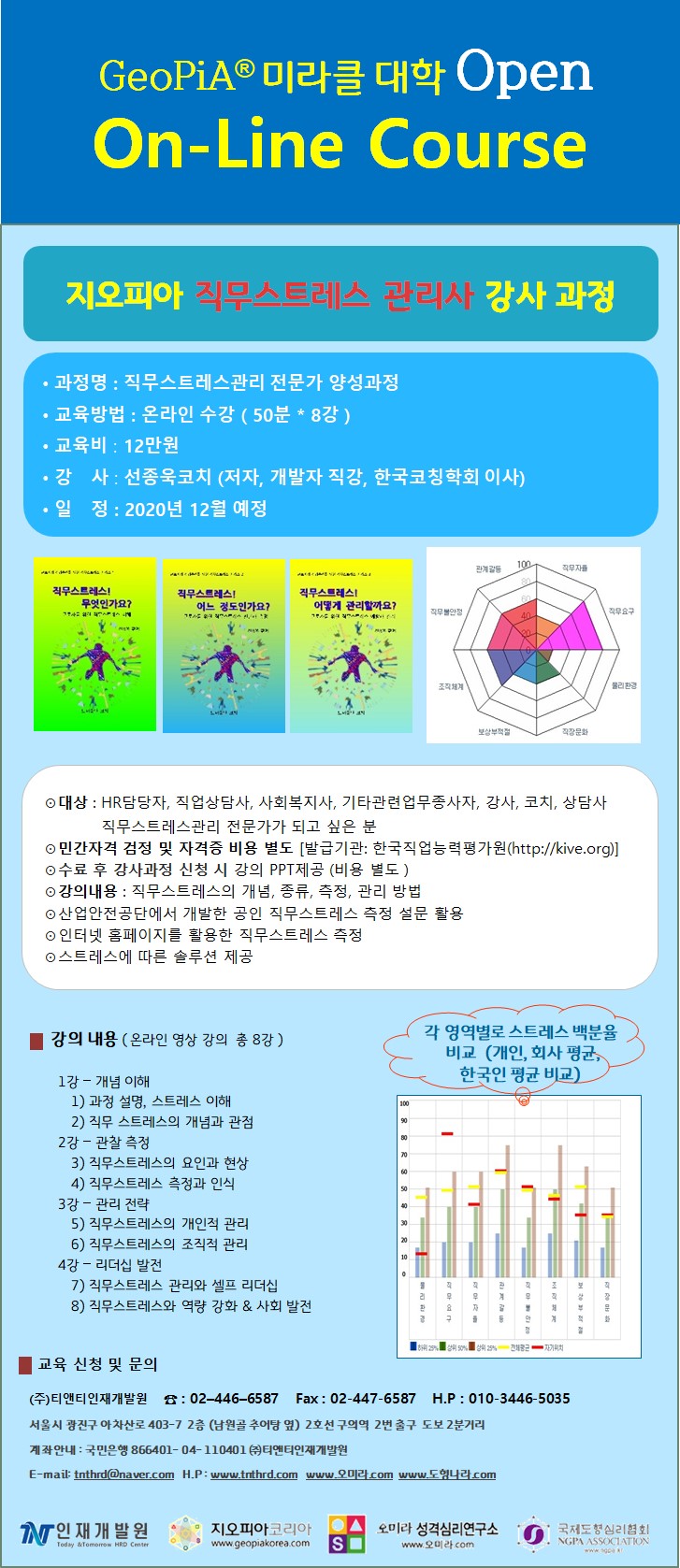 • 과정명 : 직무스트레스관리 전문가 양성과정(민간자격취득과정) • 교육비 : 10만원( 자격검정료 별도, 수료 후 강사과정 파일 제공 별도 ) • 강 사 : 선종욱코치 (저자, 개발자, 한국코칭학회 이사) • 일 정 : (온라인강좌 1주에 50분 영상 * 1 = 총 8주차 수강) ⊙대상 : HR담당자, 직업상담사, 사회복지사, 기타관련업무종사자, 강사, 코치 상담사, 직무스트레스관리 전문가가 되고 싶은 분 ⊙ 수료 후 강사과정 신청 시 강의 PPT제공 (비용 별도 ) ⊙ 수료 후 우수교육생 강사과정 수료 후 강의기회부여 ⊙ 산업안전공단에서 개발한 공인 직무스트레스 측정 설문 활용 ⊙ 인터넷 홈페이지를 활용한 직무스트레스 측정 ⊙ 스트레스에 따른 솔루션 제공 ⊙ 민간자격 검정 및 자격증 비용 별도 온라인교육용 홈페이지 : 티앤티인재개발원 홈페이지 상단 좌측 로고 참조 지오피아에듀닷컴 / http://geopiaedu.com ▶교육신청하러가기 : https://forms.gle/fL9FvNNxKxGwJFdc7 ★ 전체교육일정보기 : goo.gl/p9DgNa ◈ 과정문의 ★ ☎ 02–446–6587 / Fax : 02-447-6587 ★ 교육비입금계좌 : 국민은행 866401- 04- 110401 (주)티앤티인재개발원 ★ 홈페이지 : (주)티앤티인재개발원 www.오미라.com ★ 민간자격관련안내 참조 직무스트레스관리사 [발급기관: 한국직업능력평가원(http://kive.org)] 민간자격정보서비스 - '직무스트레스관리사' 검색 / 관리기관 : 한국직업능력평가원 민간자격등록번호 : 2008-0315 / 자격검정료 발급비 : 10만원 ★ 적정인원이 안될 경우 폐강될 수 있습니다 ![]() |