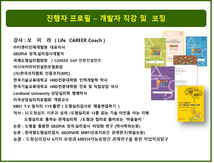 ▧ 수업방식 : 매주차 별 동영상 수강 * 10주 과정 ▧ 수업내용 : 지오피아검사 개요 / 지오피아검사 방법 / 검사결과 해석 / 그림검사 분석 ▧ 온라인교육용 홈페이지 : 티앤티인재개발원 홈페이지 상단 로고 참조 지오피아 에듀 닷컴 / http://geopiaedu.com 수료 후 특전 1. 지오피아성격.심리검사지 구입 및 사용자격부여 2. 도형심리 GPA® 디브리퍼 자격과정 2급 자격검정 응시기회부여 3. GeoPiA 온라인검사(2만원) 무료제공 4. 수료 후 국제도형심리협회 정회원 가입자격 부여 5. 1급 수료 후 지오피아 도형심리.성격검사 전문강사신청자격부여 =============================================================== ◈ 과정문의◈ ★ ☎ 02–446–6587 / Fax : 02-447-6587 ★ 교육비입금계좌 : 국민은행 866401- 04- 110401 (주)티앤티인재개발원 ★ 홈페이지 : (주)티앤티인재개발원 www.오미라.com 온라인교육 : http://geopiaedu.com( 지오피아에듀닷컴) ★ 유투브 : 오미라성격심리연구소 https://www.youtube.com/channel/UC1-Oz1GC5wsFQ7Uh9pNp6XQ ![]() ![]() |